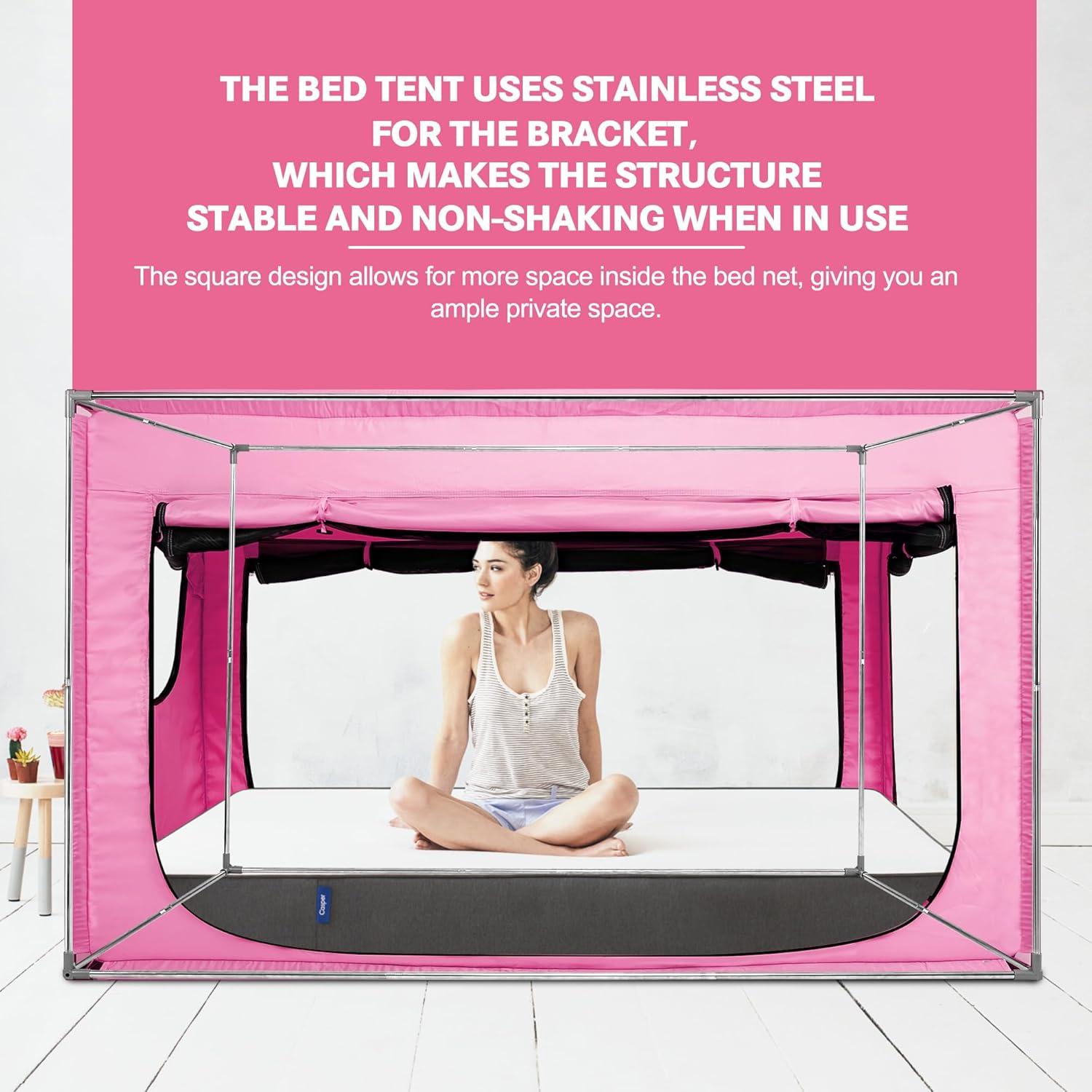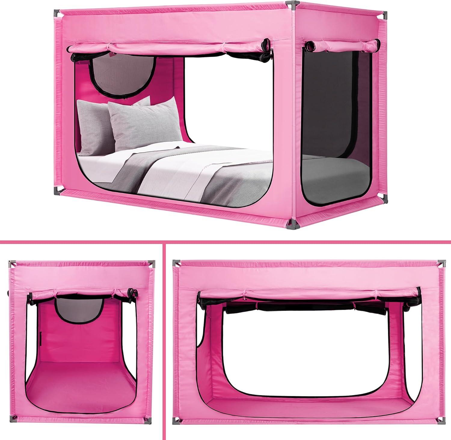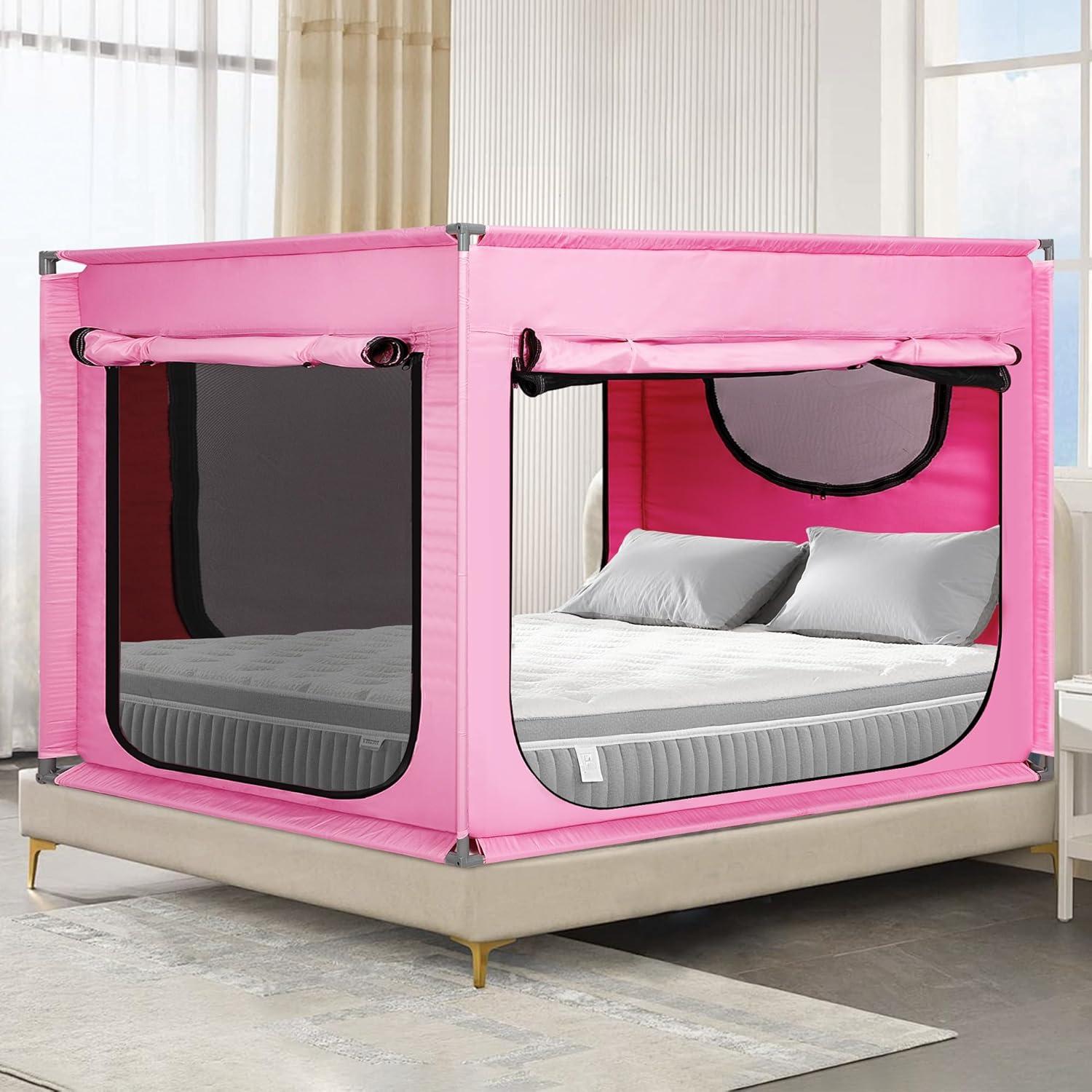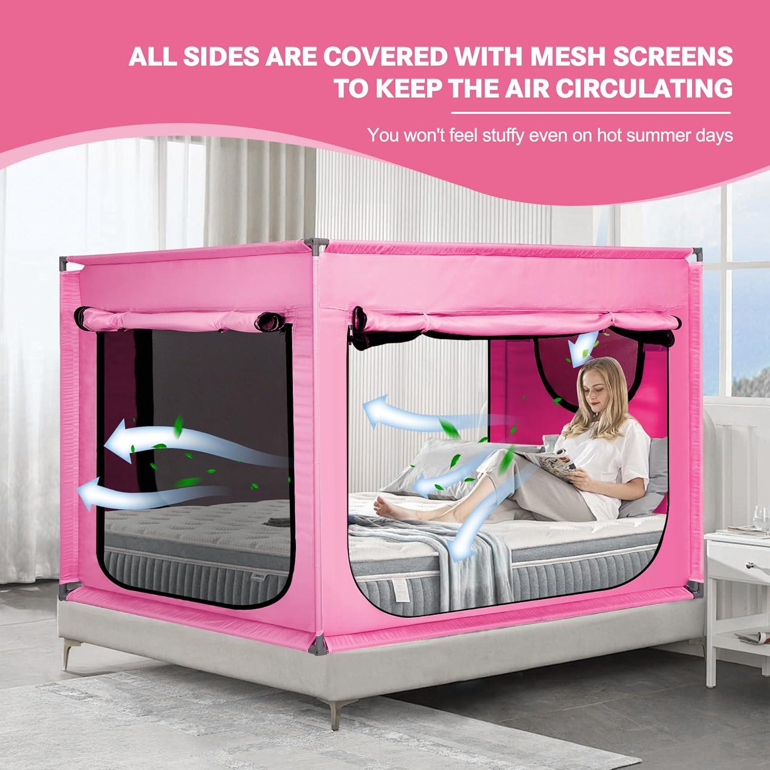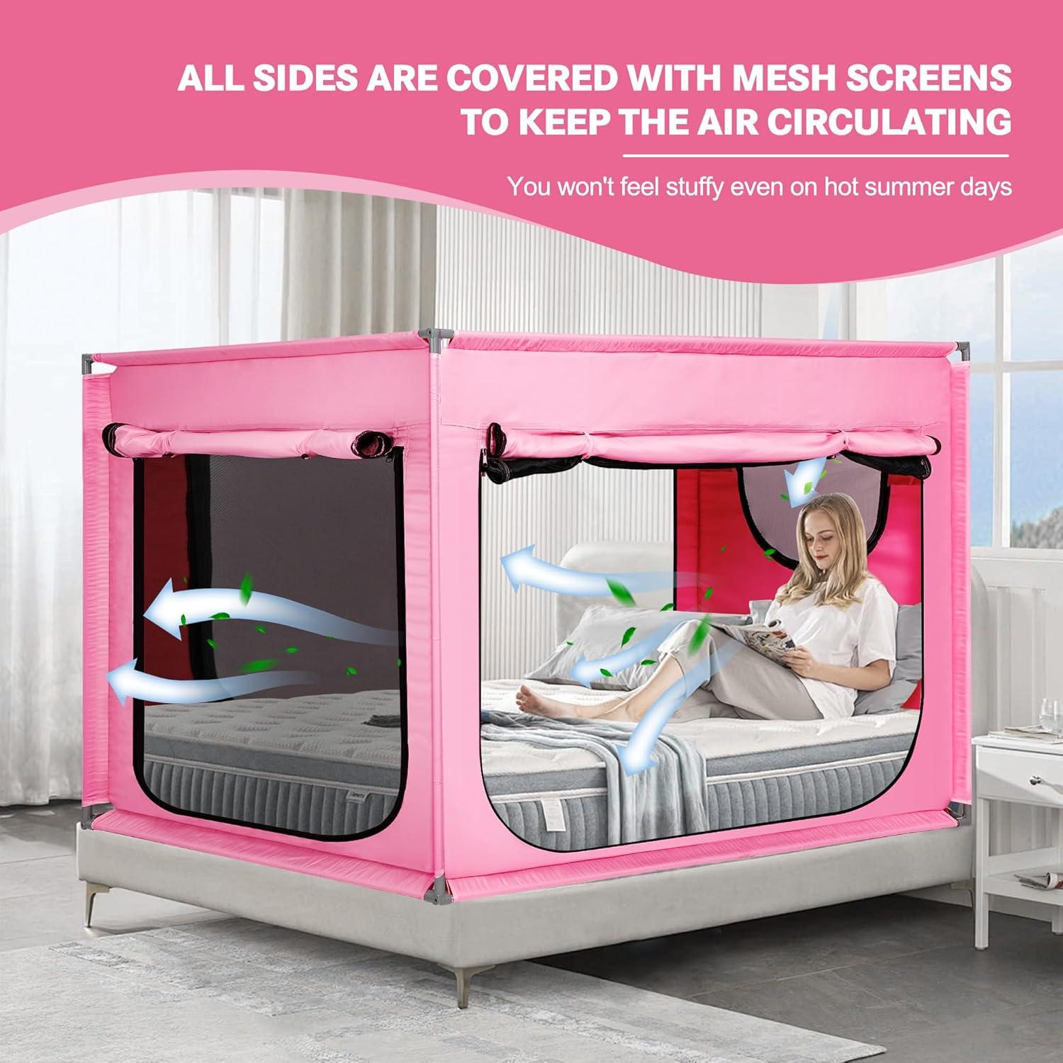 Bed Canopy Portable Blackout Bed Tent Privacy Tent for Adult Indoor Sleeping with 3 Doors, Storage Bag(Pink)
