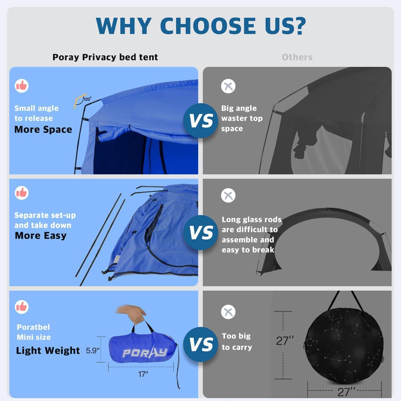 Stable & Durable – The bed tent can set up in a few time. After simple assembly and placement in a suitable mattress,the bed tent structure is sturdy and stable, not easy to collapse. The double zipper design makes the zipper door open more smoothly and the thickened 9mm fiberglass rod frame is more sturdy and durable