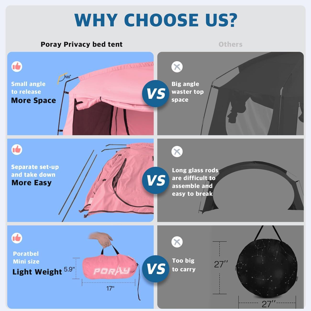 Stable & Durable – The bed tent can set up in a few time. After simple assembly and placement in a suitable mattress,the bed tent structure is sturdy and stable, not easy to collapse. The double zipper design makes the zipper door open more smoothly and the thickened 9mm fiberglass rod frame is more sturdy and durable
