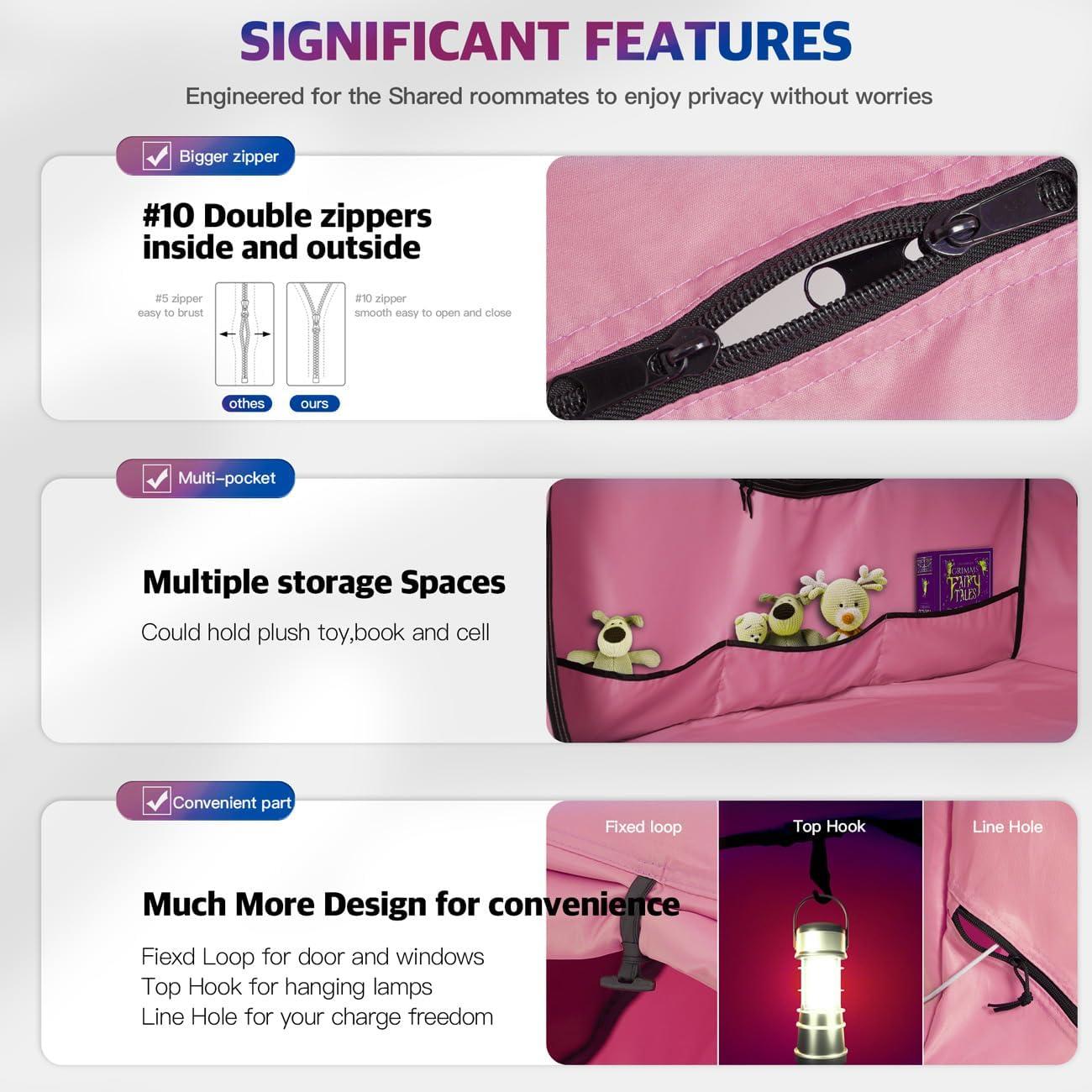 Privacy & Breathability – Our easy set up privacy bed tent is made of fabric with excellent light blocking and breathability. In terms of product design, we achieve 360 ° all-round privacy and Light blocking reaches 90%, providing you and your kids with a comfortable and safe sleeping environment . In addition, the drapes tent also includes 3 zipper doors and a side window, with mesh panels on the side door and window for ventilation