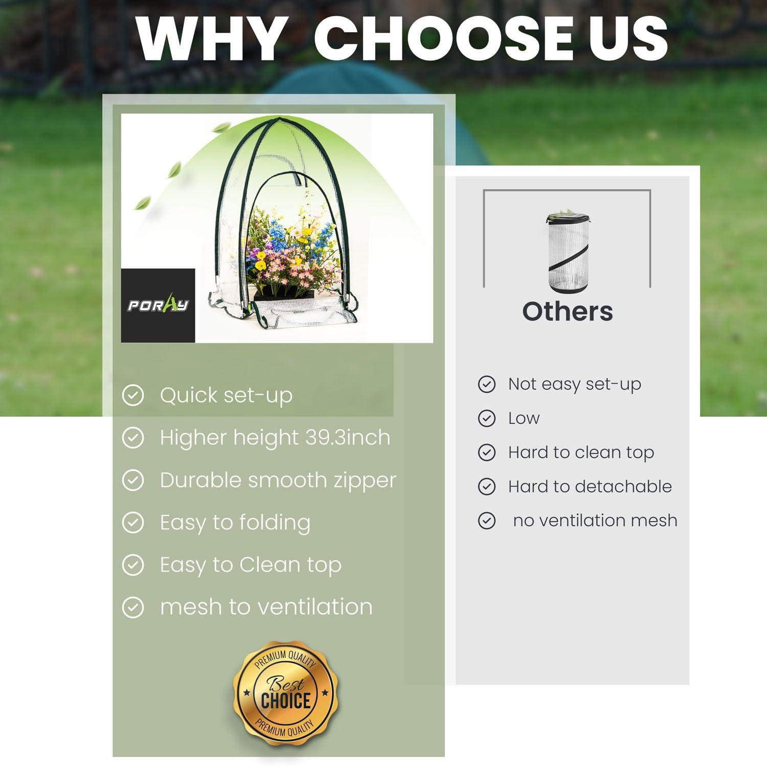 HUMANIZED DESIGN -The pop-up greenhouse is very easy set up featuring humanized design with 4 large zip-able front/back roll-up doors. It includes 2 mesh windows with PE/mesh fabric for better ventilation, 2 fiberglass poles and triangle imitation roof design preventing rain/snow buildup