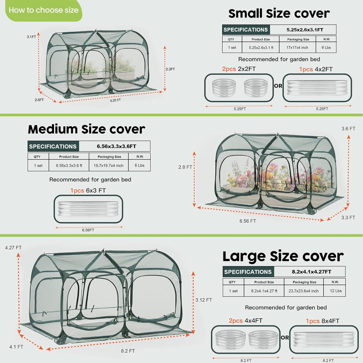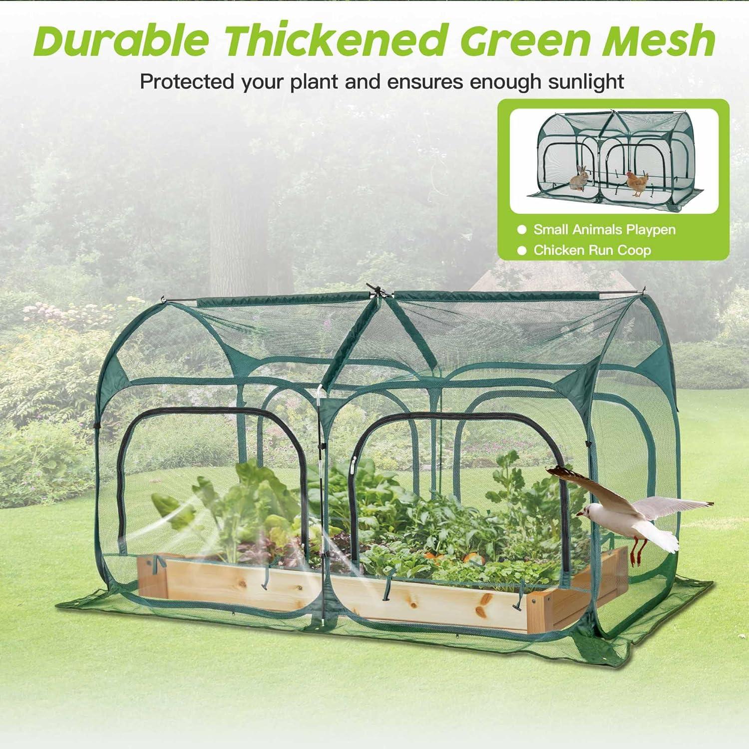 Easy to open – pop up gardening net can be opened within 3 second,very quick and great for indoor and outdoor use and has a closed top to protect your animals and plant from aerial predators,There are also a total of 4 zipper doors in the front and back for easy access
