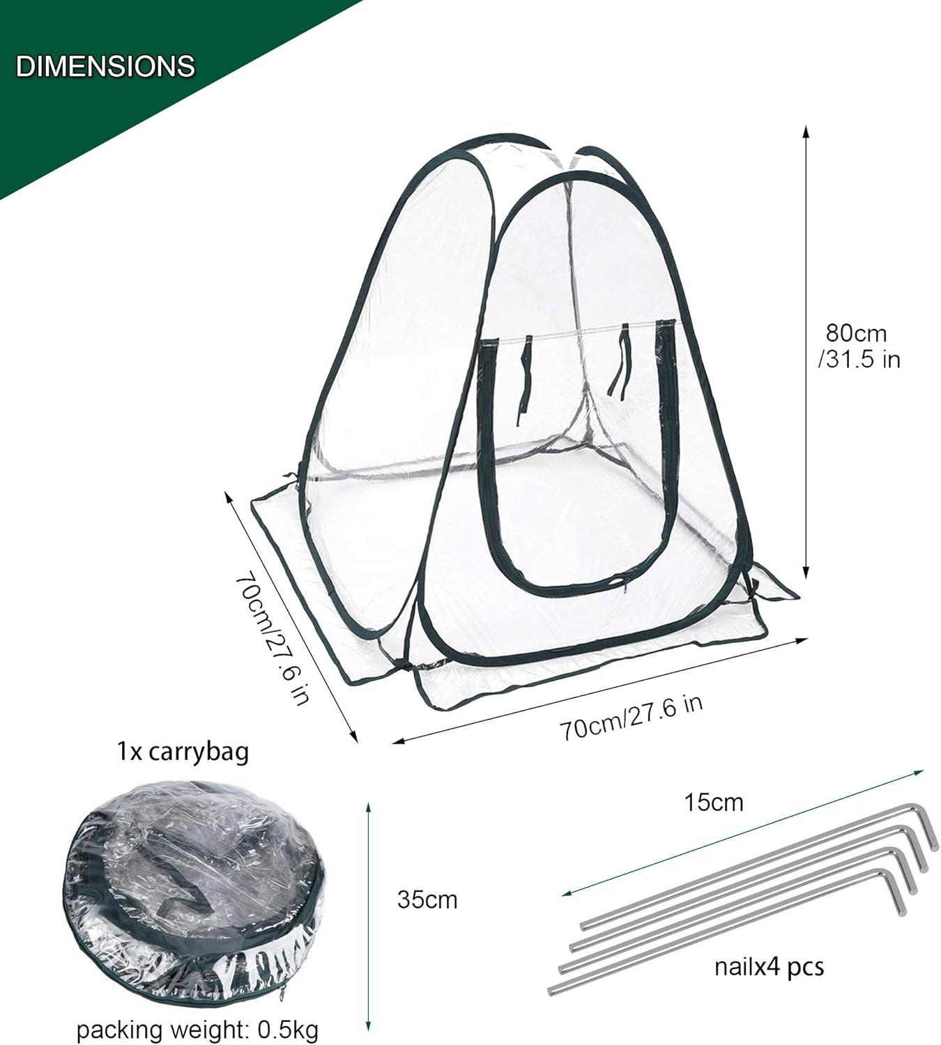 LARGE SPACE – The size of the greenhouse is 183x183x215cm/72″L x 72″W x 84.6″H, weighting8.6kg, which is about 18.92 pounds and folds down to a travel size of 31.5″L x 31.5″W x 2.68″H.