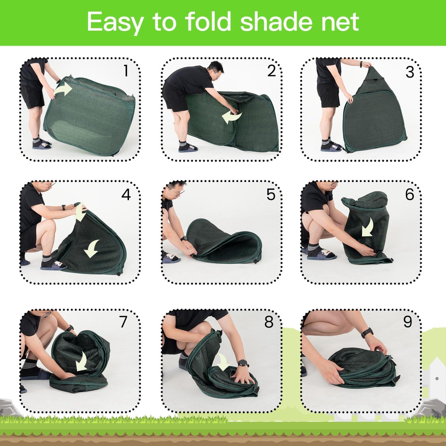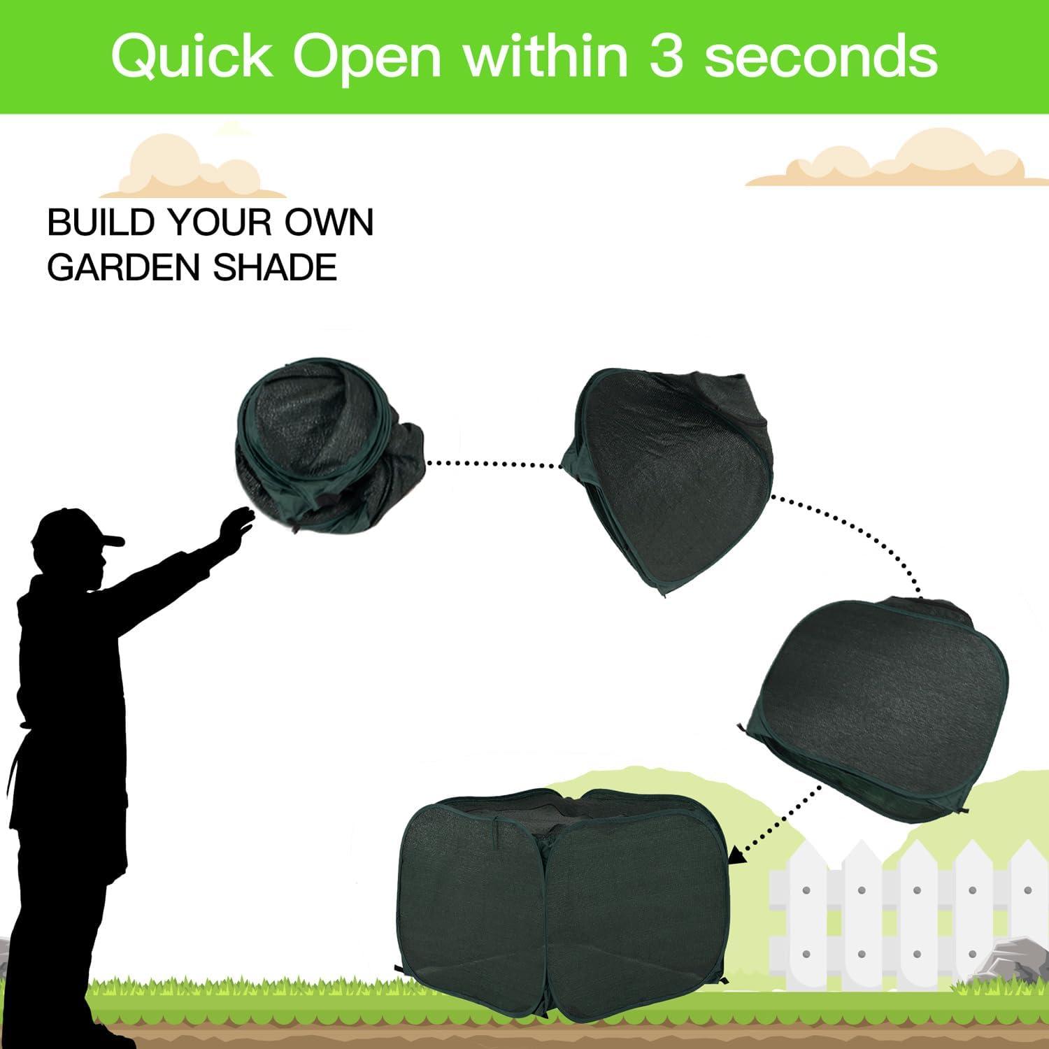 Product size and packaging -Our Pop up sunshade cloth each size is 100x100x70cm / 39.3×39.3×27.5inch and weight each one only has 2.7lbs, it can be folded in 15.75inch carry bag very easy to portable. our small-sized sunshade net can be quickly opened and stored without the need for assembly.