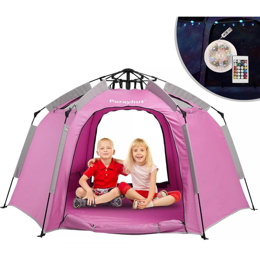 Portable Hexagon Kids Play Tent with LED Strip Lights Indoor Children Play House Easy Set-up Space Large Dream Tent for Night 4-5 Person & Birthday Gifts(Pink)